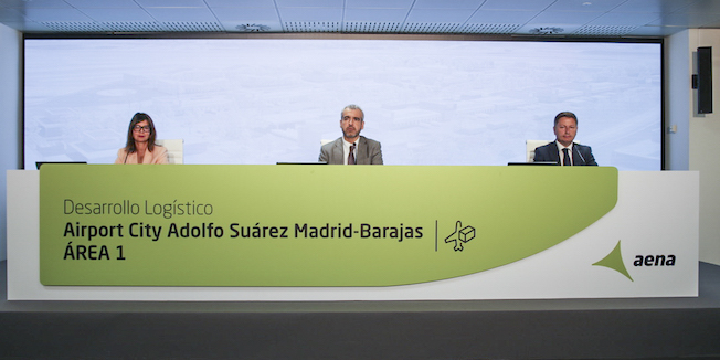 El presidente de Aena, Maurici Lucena, acompañado de la directora general Comercial e Inmobiliaria de Aena, María José Cuenda, y del responsable de gestión Inmobiliaria, Fernando Gutiérrez, presentaron ayer a potenciales inversores la primera área de desarrollo logístico de la Airport City Adolfo Suárez Madrid-Barajas, que la compañía tiene previsto licitar en el cuarto trimestre del presente año 2021.