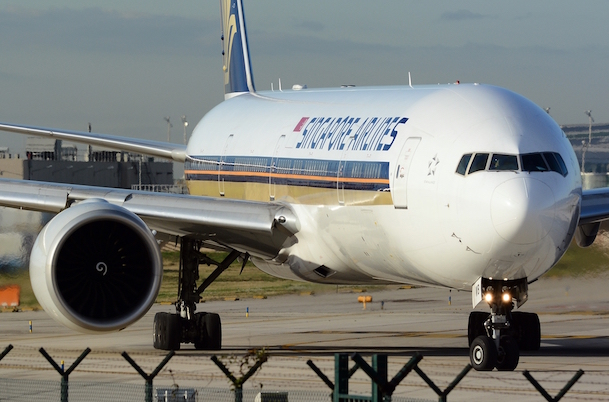 El Boeing 777 de Singapore Airlines, cuya matrícula es 9V-SWB, sufrió ayer un aparatoso incendio en el motor y el ala derecha.