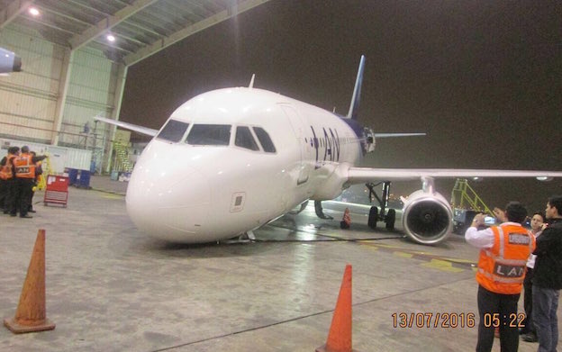 El Airbus A320, matrícula LV-BFY, fabricado en 2002 y propiedad de LATAM Airlines Argentina, sufrió ayer el colapso del tren delantero cuando se encontraba en el interior de un hangar del aeropuerto Jorge Chávez, en Perú, a fin de ser sometido a trabajos de mantenimiento. El incidentge se saldó sin heridos.