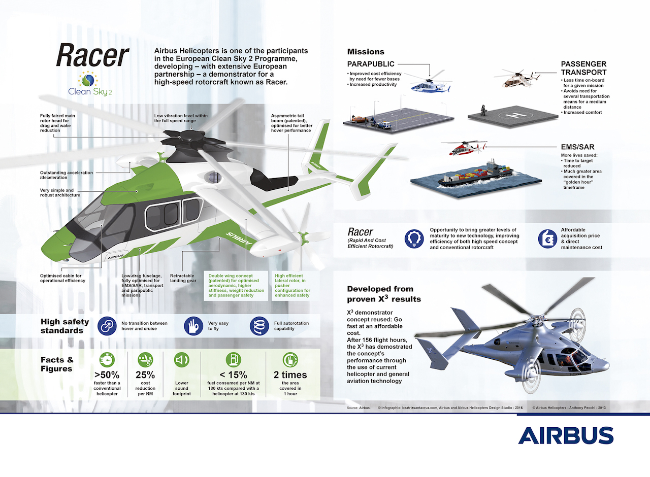 El proyecto Racer se basa en los éxitos obtenidos con el demostrador X3, financiado con fondos propios, que confirmó la validez de la configuración aerodinámica «híbrida» de helicóptero combinando el tradicional rotor principal y dos innovadoras hélices laterales. El proyecto Racer acercará ese concepto a un diseño operativo y demostrará su idoneidad para un amplio espectro de misiones en los que su mayor velocidad y eficiencia aportarán un considerable valor añadido, tanto para los ciudadanos como para los operadores: servicios médicos de emergencia y de operaciones de búsqueda y salvamento – además de los servicios públicos, transporte aéreo comercial y aviación privada y de negocios.