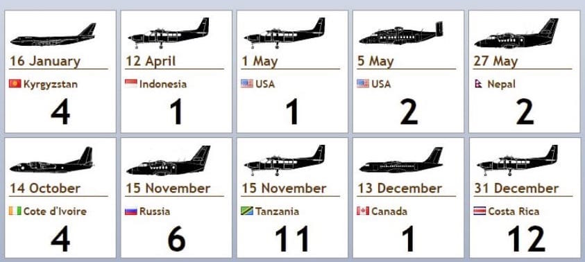 La mayoría de aviones implicados son de pequeño tamaño, monomotores y bimotores turbohélice, como el Cessna 208B Caravan que se accidentó el último día de 2017 en Costa Rica (12 muertos) o el ATR 42-500 que cayó cuando despegaba de un aeropuerto canadiense el pasado 13 de diciembre (1 muerto).