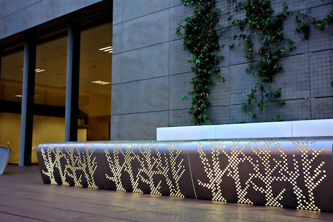 Este espacio, que cuenta con un punto de restauración, dispone ahora de una tarima elevada de 66 m2 con 9 bancos rectangulares en los que los pasajeros podrán descansar al aire libre mientras esperan el embarque. Tanto la tarima como el mobiliario, que está perforado con motivos vegetales, están equipados con tecnología LED para iluminar la zona de noche.
