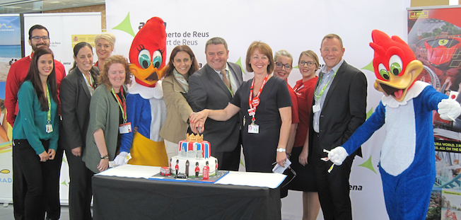 El Aeropuerto de Reus ha inaugurado hoy la ruta con Londres Stansted operada por Jet2 con la tradicional tarta de bienvenida, y ha amenizado la llegada de los 189 pasajeros con dos de los personajes más conocidos del parque temático Port Aventura.