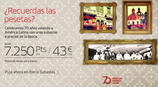 Esta semana de celebración del 70 aniversario Iberia ha querido ambientar su portal de Subastas, ubicado dentro de iberia.com, con la estética de los años 50, fecha de los primeros vuelos a América Latina. Por eso ha utilizado imágenes de entonces, papel pintado como fondo y el logo de aquella época. Además de realizar las subastas en pesetas, la moneda que se utilizaba en España en esos años.