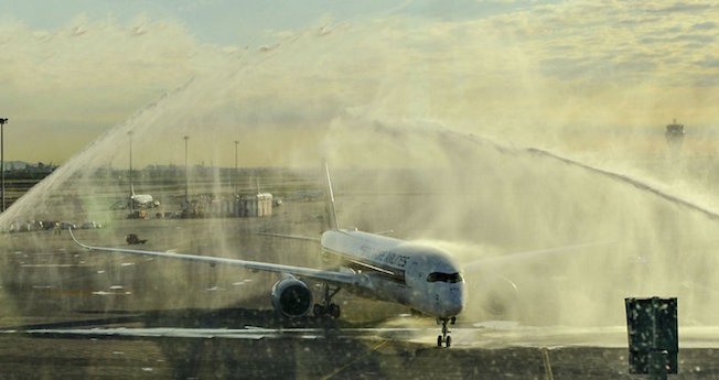 Singapore Airlines ha puesto hoy en servicio un Airbus A350-900 en la ruta que realiza entre Barcdlona y Singapour con escala en Milán. El avión llegó al Aeropueto de Barcelona-El Prat a las 8:45 horas y fue recibido con el tradicional arco de agua.
