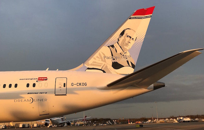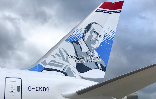 Norwegian dedica dos aviones al compositor y guitarrista flamenco Paco de Lucía (Algeciras, 1947 – Playa del Carmen, México, 2014). Se trata de un Boeing 787-9 Dreamliner con matrícuila G- CKOG, y de un Boeing 737-8.