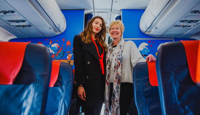 En la cabina del avión el ‘universo’ Pitufo acompaña al pasajero, pues aparecen motivos decorativos en los asientos, mamparas y la alfombra.