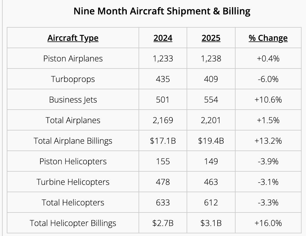 Los entregas de aeronaves durante los primeros 9 meses de 2025, en comparación con el mismo período de 2024, registraron un aumento de cinco unidades en los aviones con motor de pistón, hasta alcanzar las 1238 unidades. En cambio, se ha registrado una disminución del 6,0 % en los turbohélices, con 409 unidades (435 en 2024), y un aumento del 10,6 % en los jets ejecutivos, con 554 unidades. El valor de las entregas de aeronaves hasta el tercer trimestre de 2025 fue de 19.400 millones de dólares, lo que representa un aumento del 13,2 %.
