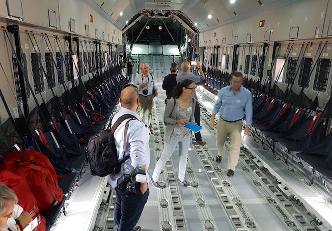 Tras ser recibidos por el jefe de la división de logística del Estado Mayor del Aire, general de brigada José Luis Pardo, los numerosos periodistas que se han acercado a la base aérea han podido asistir a un briefing a cargo del jefe del Ala 31, coronel Andrés Gamboa, en el que se les ha dado información sobre la unidad y sobre la reciente incorporación de este nuevo avión de transporte al Ejército del Aire.