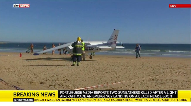 Dos personas, un hombre de adulto y una niña de pocos años sin parentesco entre ellos, han fallecido esta tarde en una playa de las afueras de Lisboa al ser arrolladas por un avión Cessna 152 que ha efectuado un aterrizaje de emergencia.