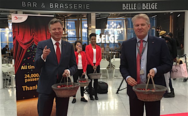 El Aeropuerto de Bruselas alcanzó el pasado 22 de diciembre la cifra récord de 24 millones de pasajeros en un año. El pasajero número 24 millones recibió una cálida bienvenida por parte del director general del aeropuerto de Bruselas, Arnaud Feist.