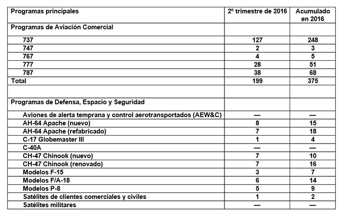 Boeing ha anunciado hoy las entregas de aviones dentro de sus operaciones comerciales y de defensa en el segundo trimestre de 2016.