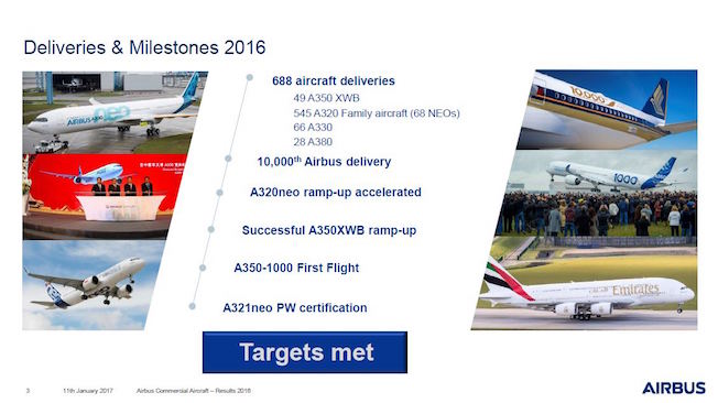 De entre los hitos que deja 2016 para la historia de Airbus destaca que entregó el avión 10.000, un Airbus A350, así como el vuelo inaugural del primer A350-1000. Además, comenzó las entregas del A320neo y se certificó el A321neo con motores Pratt & Whitney. Por último, la fabrica situada en Mobile (Alabama, EEUU) entregó el primer A321.