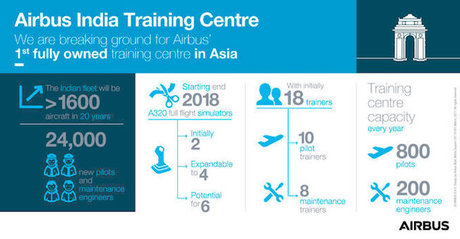 Airbus ha anunciado la creación del que será su primer centro de formación enteramente de su propiedad en el complejo Aerocity de Nueva Delhi, cercano al aeropuerto Indira Gandhi de Delhi, con la finalidad de apoyar las necesidades de la India en cuanto a pilotos de aviones airbus e ingenieros de mantenimiento.