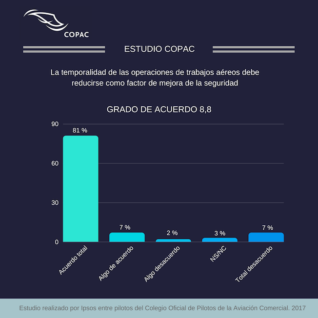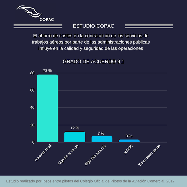 El ahorro de costes en la contratación de servicios de trabajos aéreos por parte de las Administraciones Públicas influye en la calidad y la seguridad de las operaciones. Así lo afirma un 78% de los pilotos de este sector, según un estudio realizado por el Colegio Oficial de Pilotos de la Aviación Comercial (COPAC).