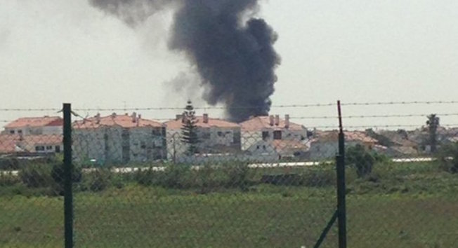El avión ha impactado contra un camión que estaba en el aparacamiento de un supermercado. A causa del siniestro se ha producido un incendio que ha afectado a un edificio cercano.