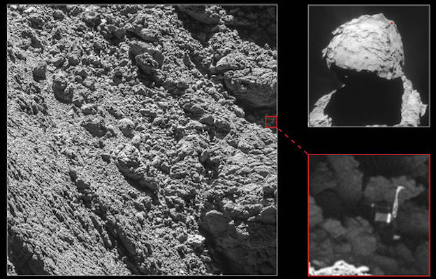 A menos de un mes de finalizar su misión, la cámara de alta resolución de Rosetta ha descubierto el módulo de aterrizaje Philae, encajado en una oscura grieta de 67P/Churyumov–Gerasimenko.